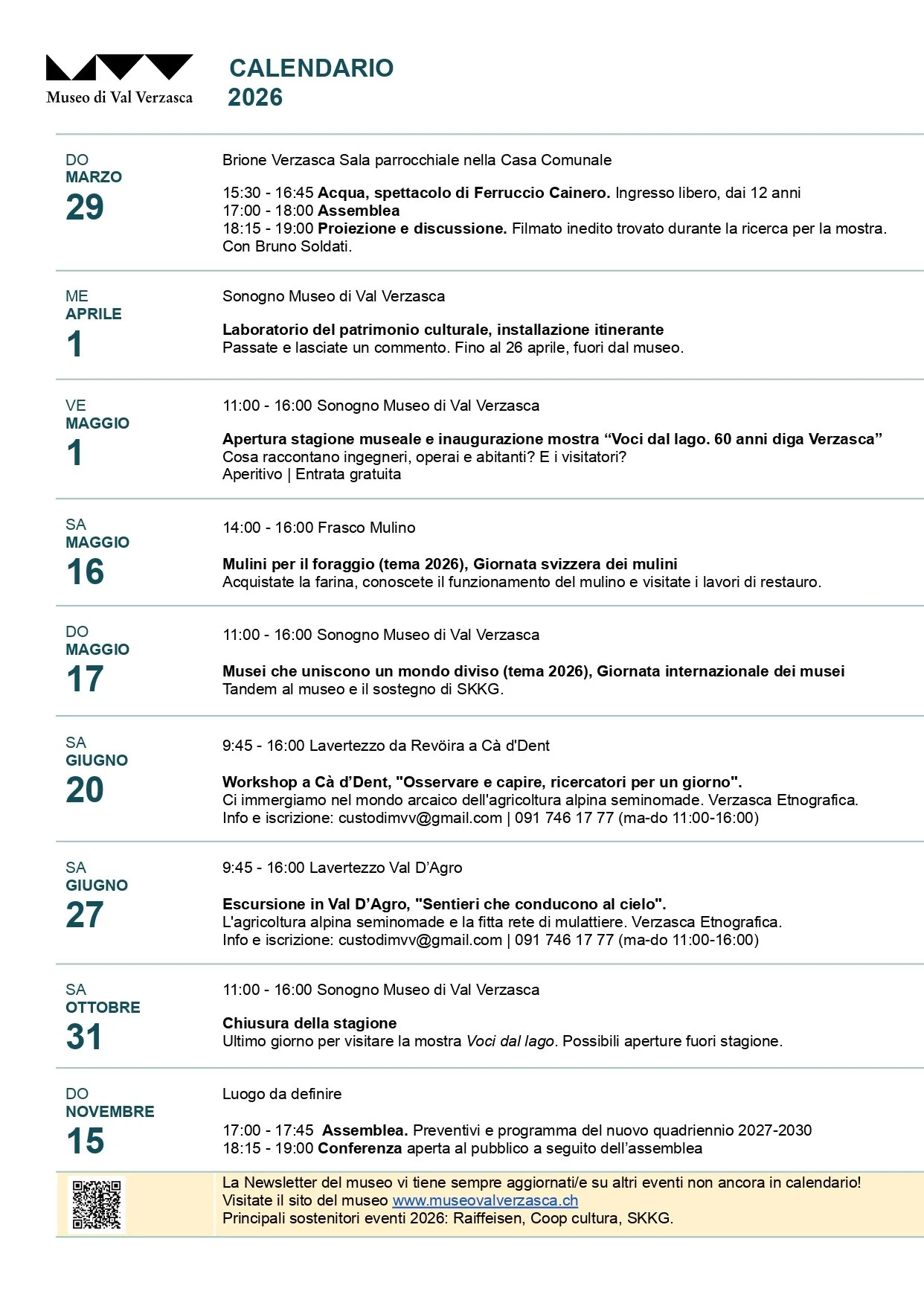 Das Hauptgebäude befindet sich in Sonogno und besteht aus zwei Gebäuden, die interaktiv die Geschichte erzählen, wie die Bewohner der Verzasca vom Mittelalter bis zur Mitte des 20. Jahrhunderts lebten von der Landwirtschaft und der Viehzucht. Frauen, Männer und Kinder praktizieren die Transhumanz, um die Ressourcen des Tals und der Magadino-Ebene auszubeuten. In den Wintermonaten gingen einige Menschen und Kinder in den Städten der Lombardei als Kaminfeger arbeiten.